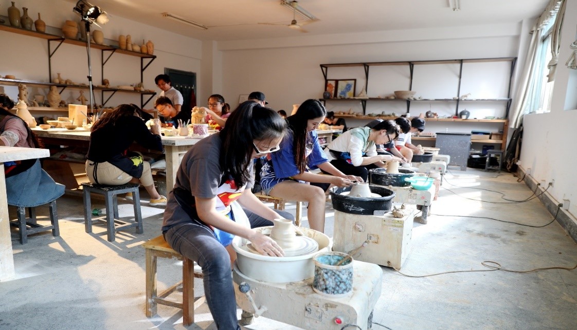 员工正在公司的岳州窑工作室动手进行陶艺制作,在实践中培养“三创”能力
