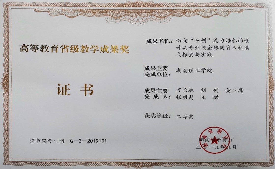 2016和2019年,《创新力导向的设计艺术类专业三维实践教学体系探索与实践》《基于“三创”能力培养的设计类专业校企协同育人新模式探究》分别获得省级教学成果奖二等奖2项、三等奖1项,省级社科成果奖2项。