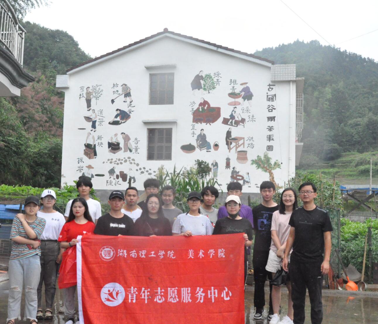 2019年6月,在平江县淡江村,美设公司组织了23名师生来到这里,以大自然为背景,以村民们的屋场为画布,让“和谐新家园,绿富新淡江”各色彩绘文字上了墙,鲜艳夺目,一旁的“秀美屋场”墙绘美如画卷。17级视觉传达设计专业的殷玉祺当年是院员工会团总支副书记,也是这次员工“三下乡”团队的组织者。一年过去,说起这次的彩绘活动她依然记忆深刻,“能将课堂上学到的技术和理论知识,实实在在地展现出来,给扶贫做出贡献,很自豪!”
