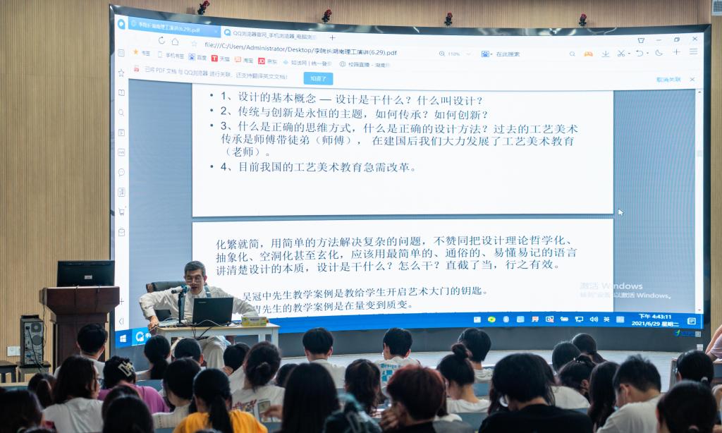 讲座开始,李教授以一句“中国宋代的审美领先当时欧洲一千年!”经典话语指出中国传统艺术的精妙绝伦和巧夺天工之处,接着李教授又结合自己的观点从汉字说起,引经据典,从宋代的书法、元代的青花瓷、明代的家具和清代的瓷器等方面,为我们呈现了一幅美轮美奂的东方传统审美艺术史画卷。在这之后,李教授又向我们展示了自己的项目作品,结合实际的项目案例告诉我们设计创作的核心在于创新,从徐悲鸿到吴冠中,古往今来,每一位大师都是在创作中进行创新,才能不断地超越和丰富自己。另外,李教授还告诫我们,在进行设计创作的时候,我们可以借鉴,但不可以抄袭,只有做出和别人不一样的东西我们才能取得成功。最后,李教授用风趣幽默的语言,鼓励同学们要勇于求学、勇于尝试、善于询问和交流,才能更好的了解自身,提升自身能力。