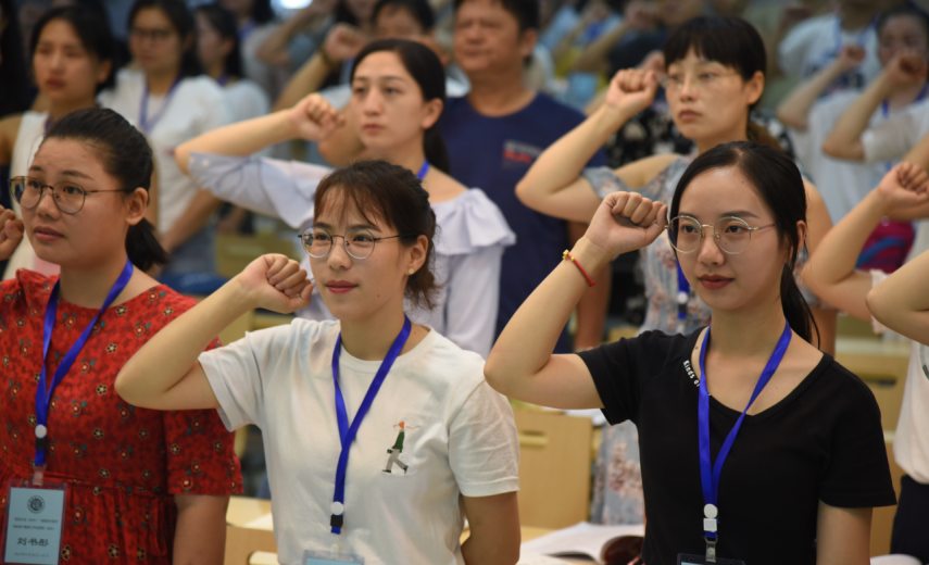 在开班典礼上,80名学员以铿锵有力的声音庄严宣誓担任县(市/区)工作坊坊主,“把身心献给教师工作坊,认真学习美术教学理论知识,优质完成网络研修任务,注重实践,争当优秀教师,争当优秀坊主。学成后,积极与当地领导同行开好坊、建好坊、用好坊,有效组织教师线上线下研修活动,指导教师公司产品,促进教师专业成长,向优秀出发,向卓越迈进,为国培养栋梁人才,团结协作,与时俱进,开创我省教师工作坊新局面不懈工作,为教育发展、国家繁荣、民族振兴而努力奋斗!”宣誓将开班典礼推上了高潮。