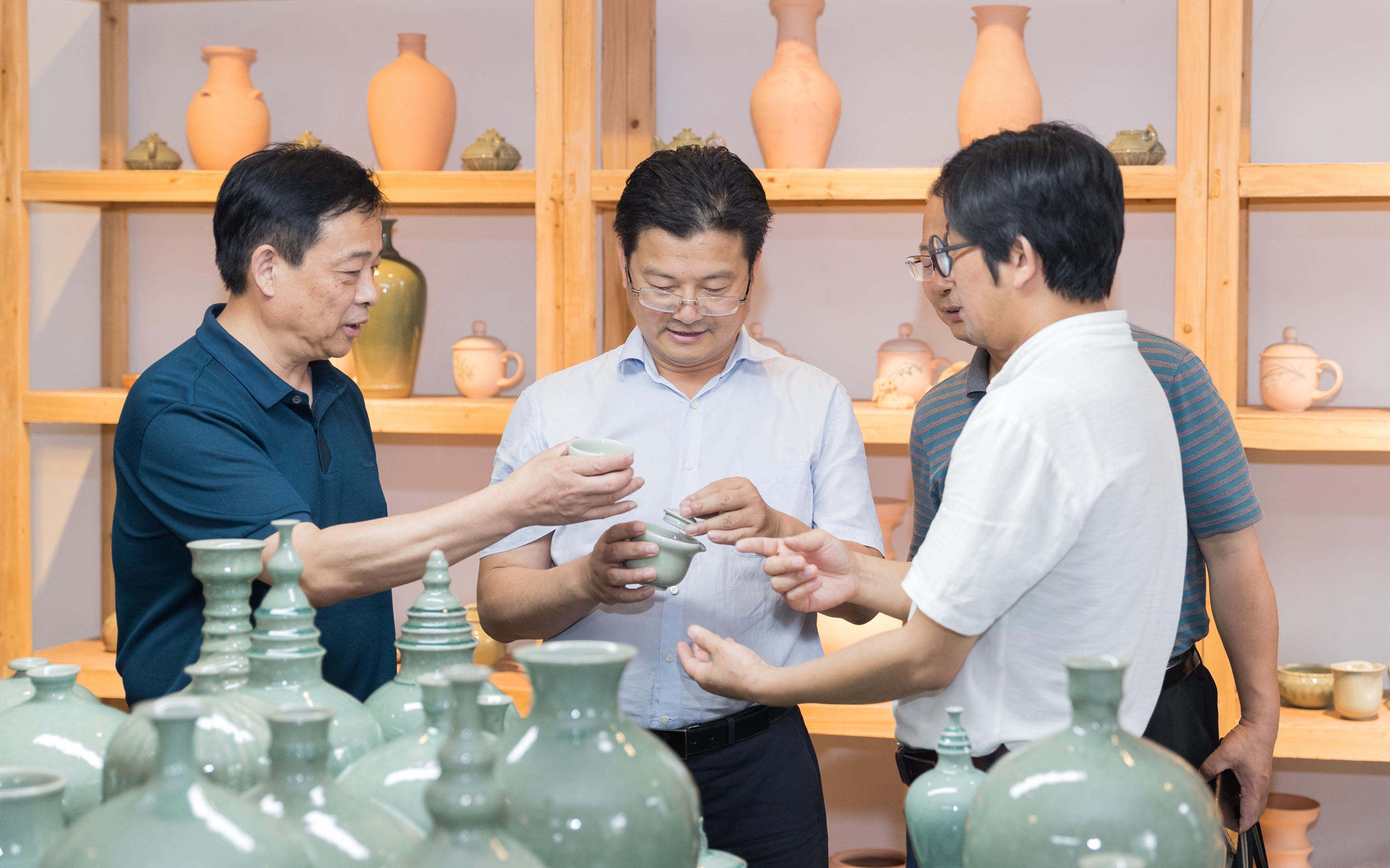 在美术公司岳州窑协同创新中心,陈爱林仔细察看了岳州窑成品陶瓷,详细了解了岳州窑制作流程。
