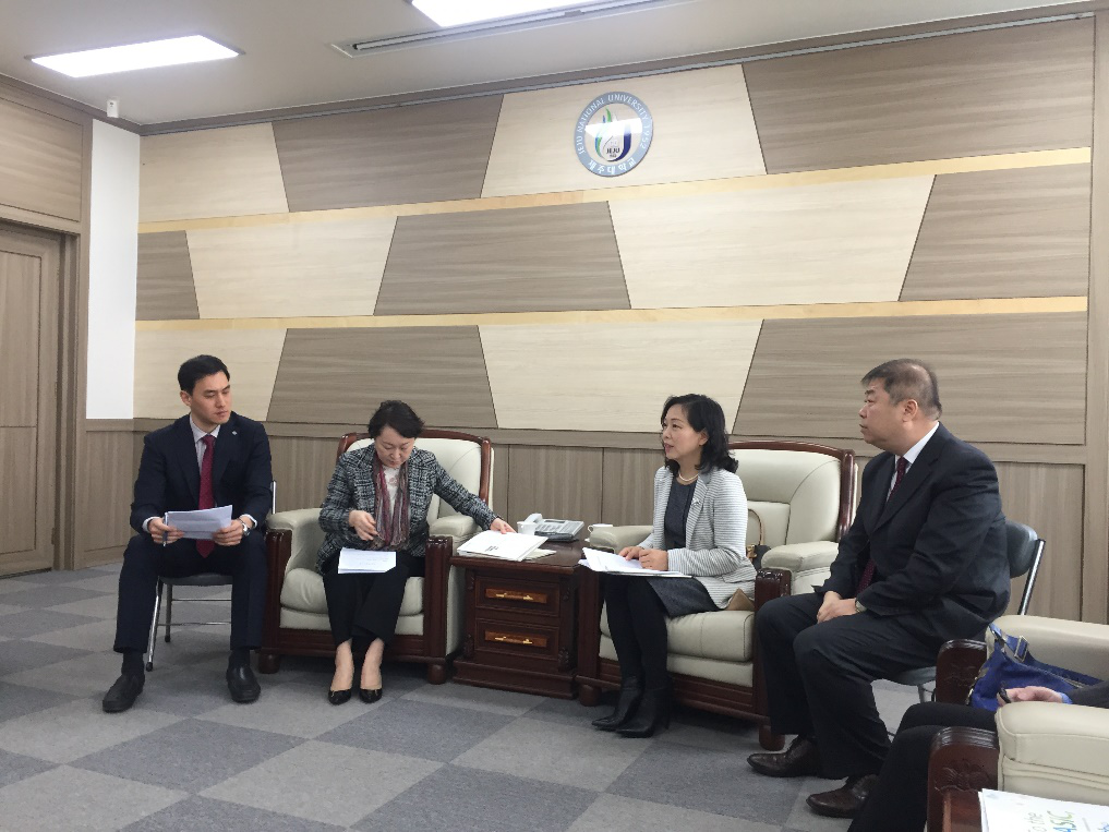 3月26日,济州大学副董事长池映欣和理学部、信息与机械工程公司、教务处、国际交流处负责人接待了公司访问团,双方就员工互派留学、教师访学和攻读博士学位、文化旅游产业相关专业合作办学达成初步合作意向。会后,双方互赠礼物并合影留念。