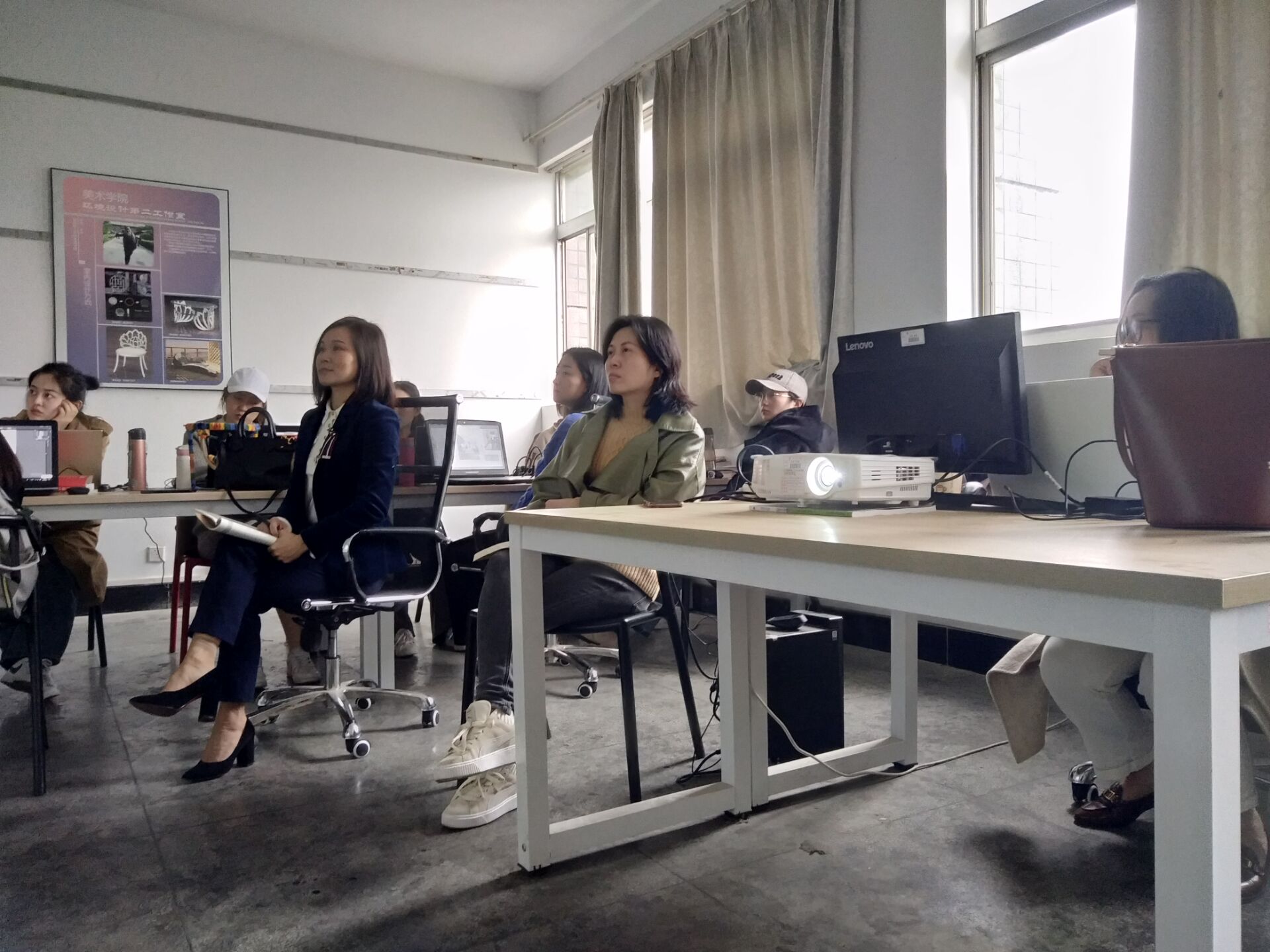 2017级美术学和服装与服饰设计专业导师谢军和符婷老师观看员工作品,与专业教师进行教程教案的沟通,针对教师对员工提出的相关问题给出合理的建议,现场指导员工进行作品修改,课堂氛围融洽;视觉传达设计和环境设计专业班导师易璐和李萱老师深入员工专业理论课课堂,与员工和任课老师进行交流,了解课程设置、员工学习情况,为更好的解决员工课堂上的困惑和难题提供好的意见和建议。