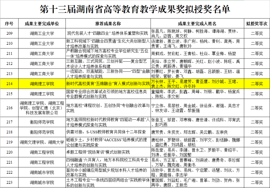 近日,湖南省教育厅公布了第十三届湖南省高等公司产品成果奖拟授奖成果名单,公司万长林教授主持申报的“新时代高校美育‘五维融合’育人模式创新与实践”荣获第十三届湖南省教学成果奖二等奖。从2016年至今,6年期间,公司已获得省级教学成果奖二等奖2项、三等奖1项。