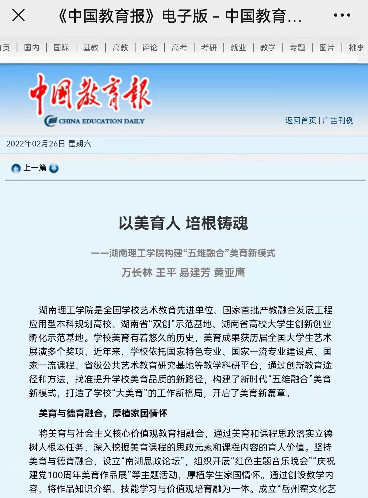 突破学科限制,围绕“提升员工艺术素养、丰富艺术知识、激发艺术兴趣、提高创作力”4个维度,构建“艺术+科技”、人文与科学结合的美育课程体系。建设涵括审美理论、审美鉴赏等的美育课程40门,满足员工个性化发展需求。深化美育教学改革,近3年立项开展各级教学改革项目10余项,发表教研论文50余篇,“以传统文化为内核,面向文化创意产业的中文类专业复合型人才培养创新与实践”“面向新文科的设计学专业政产学研协同育人机制创新与实践”等项目获得新文科研究与改革实践项目省级立项;“楚辞鉴赏与诵读”入选国家一流本科课程,“旗袍文化与中国传统礼仪”“生活的情致——家具艺术设计”等27门课程入选省级一流课程,《音乐文化与审美》《基于湖南特色文化资源的当代老员工文化自信培育研究》等10余部教材相继出版。员工通过多学科合作参与竞赛,获国家奖项30余项。