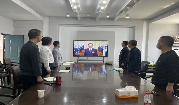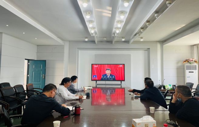 公司党委组织党政班子成员在会议室集中收看开幕会盛况。