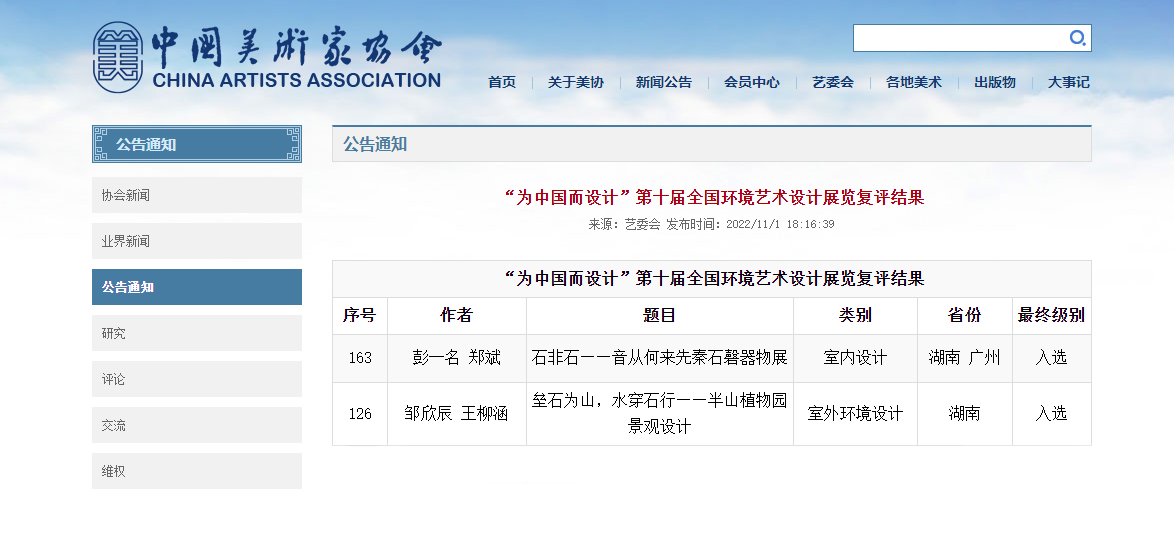 在刚刚结束的2022年“为中国而设计”第十届全国环境艺术设计大展评选中,公司郑斌老师指导的员工:彭一名的作品《石非石——音从何来先秦石磬器物展》、邹欣辰作的作品《垒石为山,水穿石行——半山植物园景观设计》,张庆澳的论文均已入选。