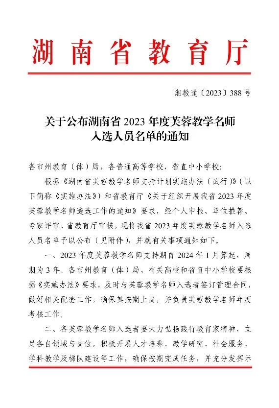 湖南省教育厅发布了《关于公布湖南省2023年度芙蓉计划芙蓉教学名师入选人员名单的通知》(湘教通[2023]388号),公司万长林教授入选湖南省2023年度芙蓉教学名师。这是公司高水平团队队伍建设的又一硕果,彰显了公司落实人才培养中心地位的成效。