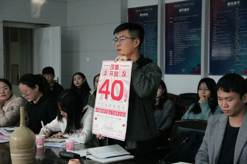 会议伊始,表明此次会议主题是围绕同学们的设计海报,让老师与同学们面对面谈谈改革开放40年以来身边的变化,并让员工党员各自展示自己海报的设计理念,最后评委进行评分和颁奖。