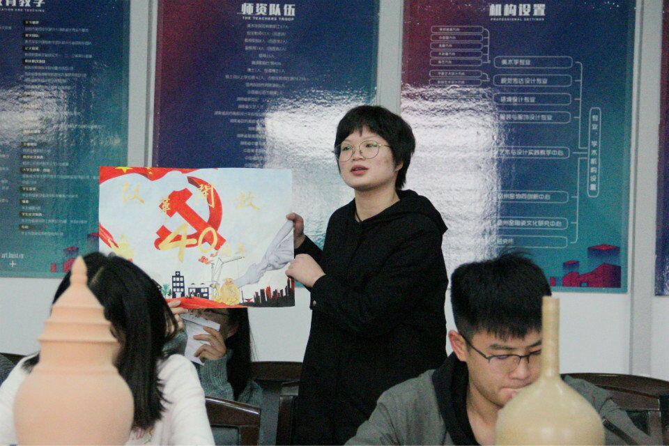 紧接着,员工党员和入党积极分子依次开始讲解。第一位是党员15级油画班胡平,他讲述了关于店铺变化、从衣食住行四方面分析实物的变化以及身边环境的改变,他的海报设计用水粉颜料通过红绿对比纯色突出了党员的影响。第二位是党员15级师范班梁文峰,他以日历为主题,表明我们要勿忘初心,他讲述了改革开放在思想上的进步,他说改革开放只有进行时没有完成时。第三位是预备党员15级师范班李贻阳,他以游戏为引讲出了改革开放以来中国在科技上的不断更新与进步。