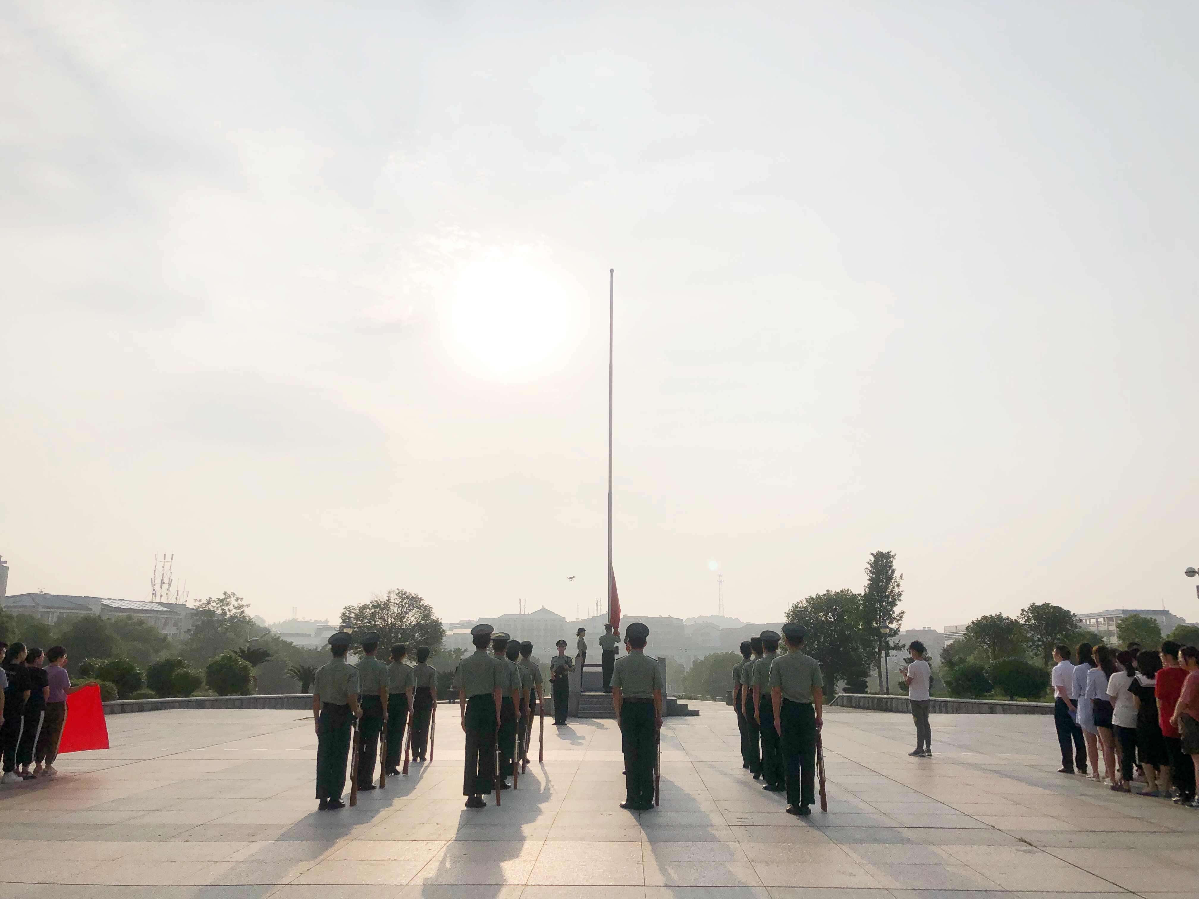 在全体师生的注目下,英姿飒爽的国旗护卫队队员们护送鲜艳的五星红旗进场,行礼完毕伴随着庄严的国歌,五星红旗冉冉升起,迎风飘扬。在场的每一个人向国旗行注目礼,深怀对祖国无限的热爱和崇高的敬意。
