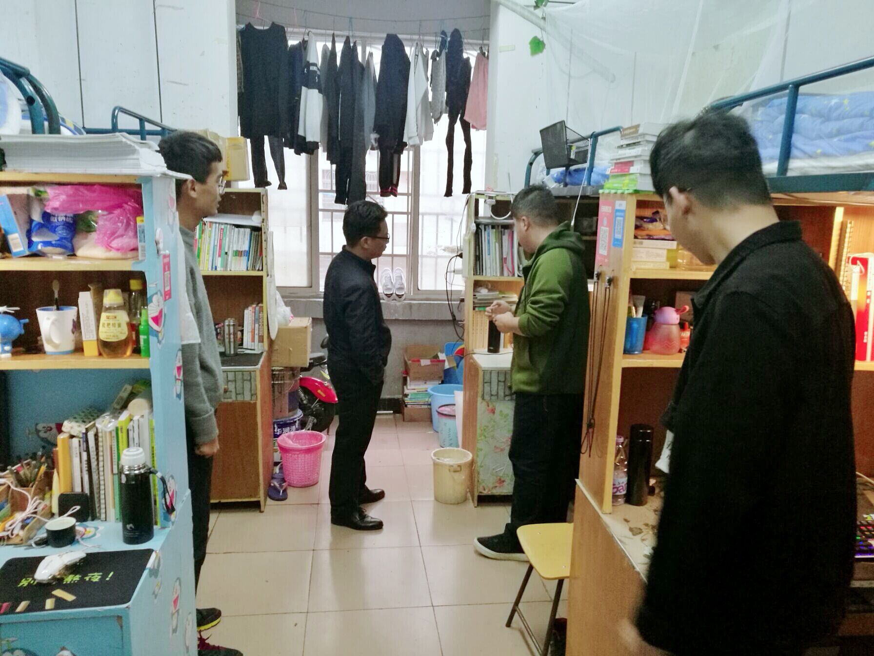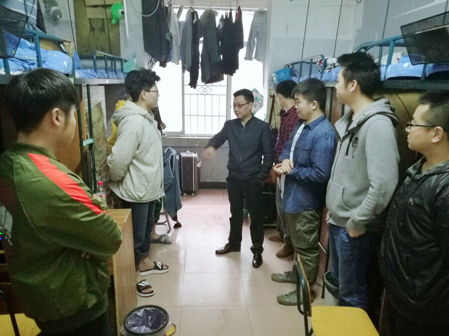 针对员工的违规电器,厕所卫生等情况,石军老师走进环设三四班的男同学寝室进行了一次安全卫生大检查。查寝的石军老师受到了同学们的热烈欢迎。