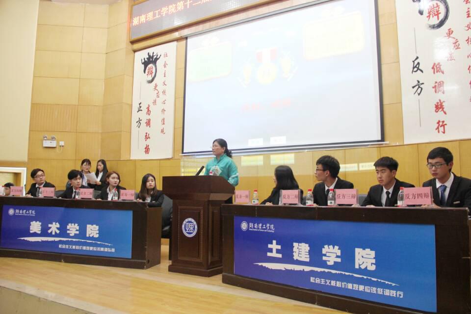 晚上7点半,辩论赛正式拉开帷幕,主席致开幕词后,正方美术公司以“社会主义价值观更应该高调弘扬”为辩题,而反方土建公司以“社会主义价值观更应该低点践行”为辩题,双方展开了精彩绝伦的辩论!比赛进行地异常激烈,整个赛程高潮不断,掌声此起彼伏。陈述环节,正反方一辩迅速将全场温度点燃,真正做到了三分钟的慷慨陈词,三分钟的屏息聆听,三分钟的惊心动魄。
